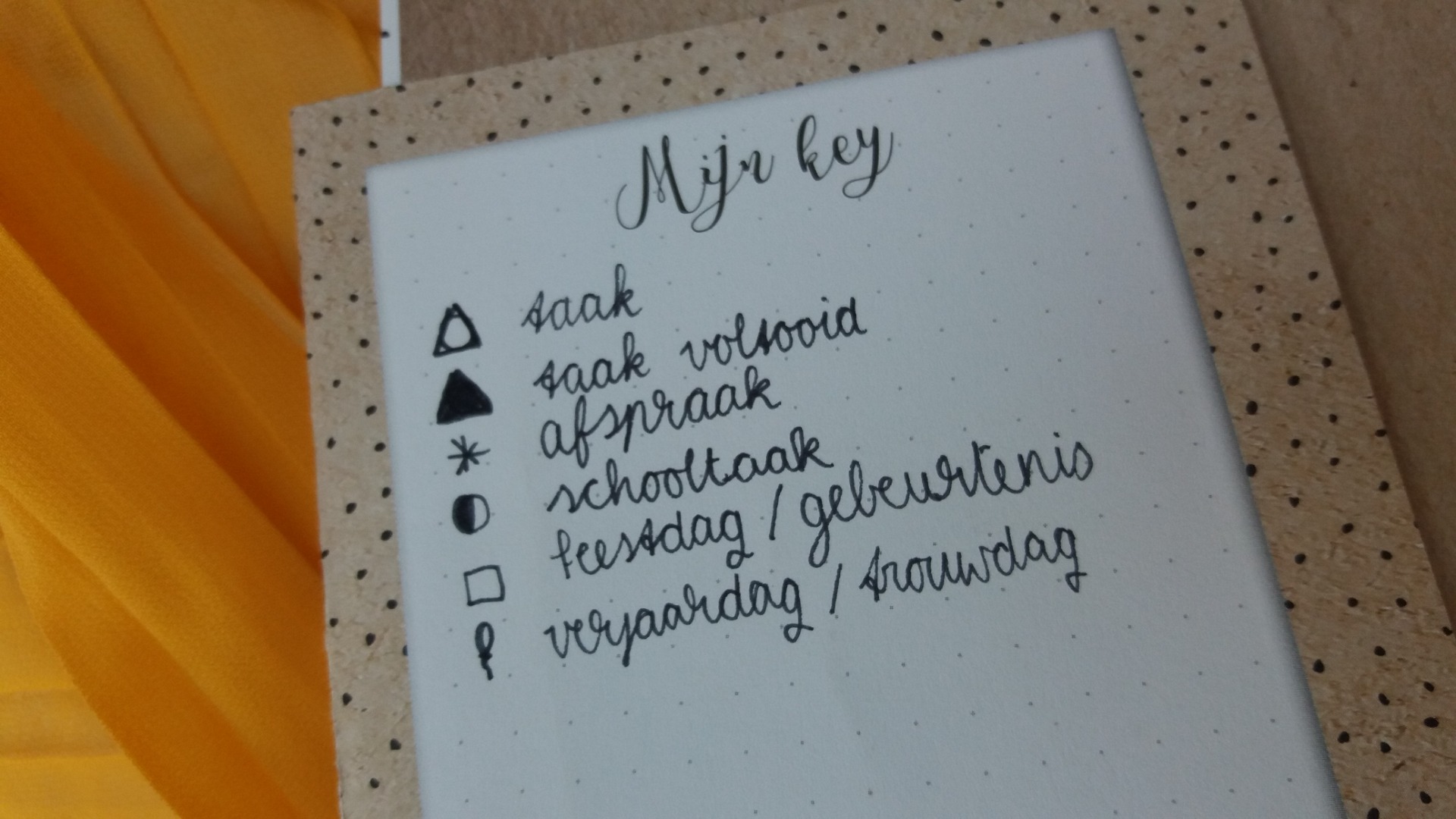 Gebruik maken van categorieën staat in dit lijstje op nummer 2. Eigenlijk een soort legenda die je gebruikt als je iets opschrijft in je agenda. Bij de bullet journal methode word dit vaak de 'key' genoemd. In mijn bullet journal, die ik o.a. gebruik voor mijn agenda, maak ik ook gebruik van een key. Ik vind dit persoonlijk heel fijn werken omdat ik dan duidelijk kan zien wat het precies is. Ik heb 6 symbolen voor 6 verschillende 'categoriën' (ook al is dat het misschien niet helemaal)