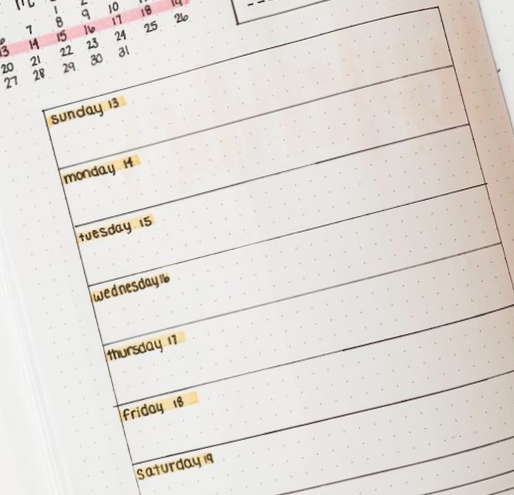Overzicht kan je maken door duidelijke lijnen die aangeven wat bij welke dag hoort. Zorg dat er niet te veel afleiding is door bijv. veel kleuren of drukke patronen. Hou je niet van strak en rustig maar ben je wat meer creatief? Prima als je je agenda helemaal oppimpt maar zorg wel dat er overzicht blijft!